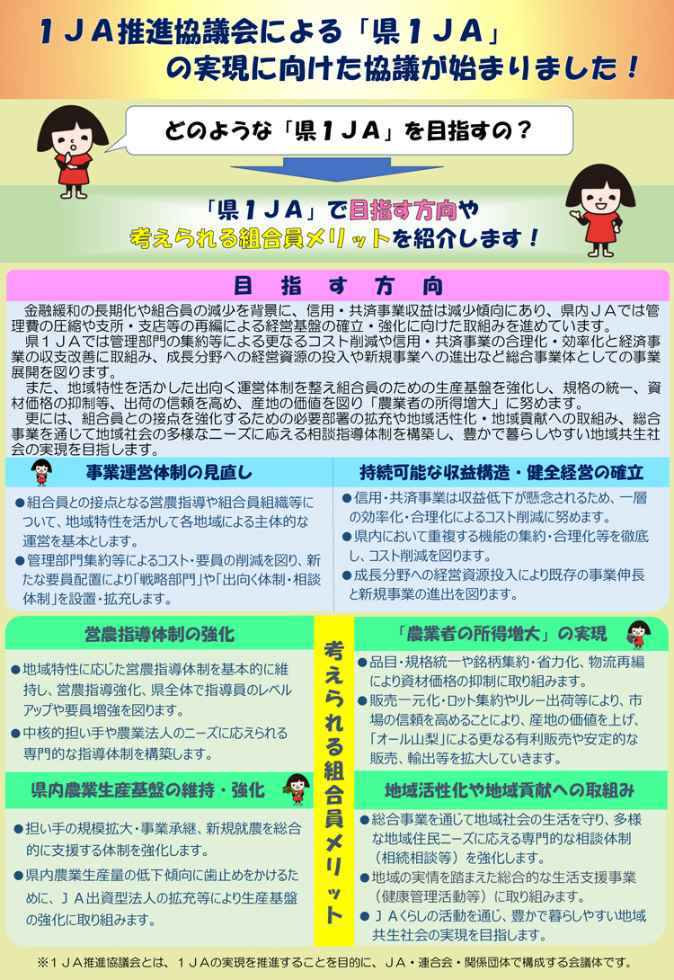 JAの果たすべき役割を十分に発揮するため、JAグループ山梨は持続可能な経営の確立に向け、組織基盤強化の在り方を検討しています。その選択肢のひとつとして「県1JA」に向けた協議を進めています。