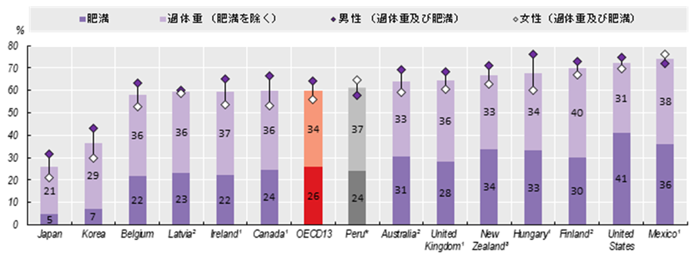 また、より信頼性の高い指標である身長と体重の測定値の利用可能な国の数は限られているものの、測定データがあるOECD加盟13か国と加盟候補国ペルーの2023年または入手可能な最新年で、15歳以上の過体重および肥満率を見てみると、アメリカはメキシコに次ぐ第2位72%の過体重・肥満大国である。ちなみに、日本は当該国中最も低い26%である。