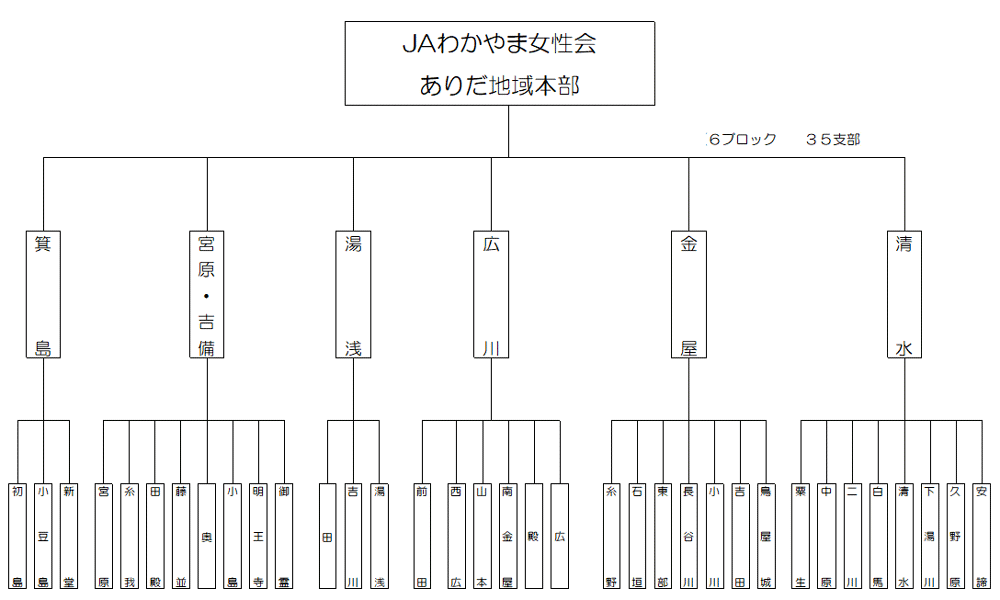 同女性会の組織機構を示したものが図1である。ブロックは各支店のエリアを範囲としており、全部で6ブロックに分かれている(うち、宮原・吉備ブロックは2支店を含む)。その下部組織にあたる支部は集落(字)の単位で構成されており、現在35支部存在する。