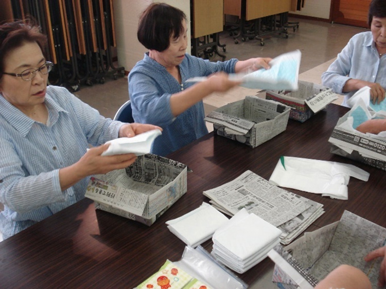 その主な活動の一つが、新聞紙を使った簡易トイレ作りである。2020年以降はコロナ禍の影響で活動が制限される中、支部やブロックで集まる機会を活用し、簡易トイレを作製するようにした。こうした取り組みを通じて、各支店で少しずつ備蓄を進め、現在では全支店で約5,000個を備えることができたという。