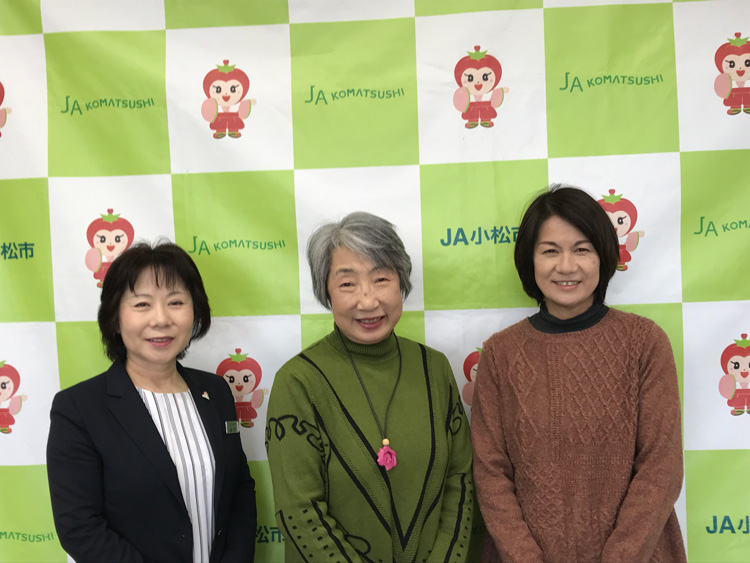 右から、今川浩美理事、中田由利香女性部長、JA小松市総務部組合員相談課の谷口早由里課長補佐