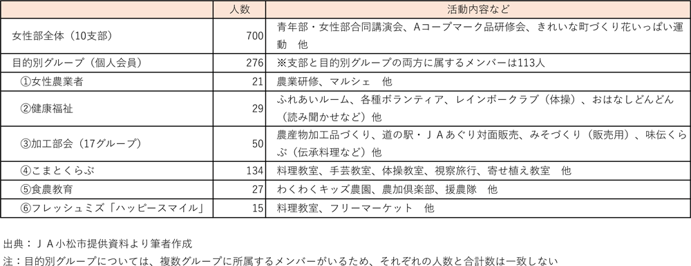 現在同JA女性部には、10の支部と6つの目的別グループが共存している。支部と複数の目的別グループの両方に所属している人もいれば、目的別グループのみに所属している人もいるなど、選択は個人の自由としている(表)。